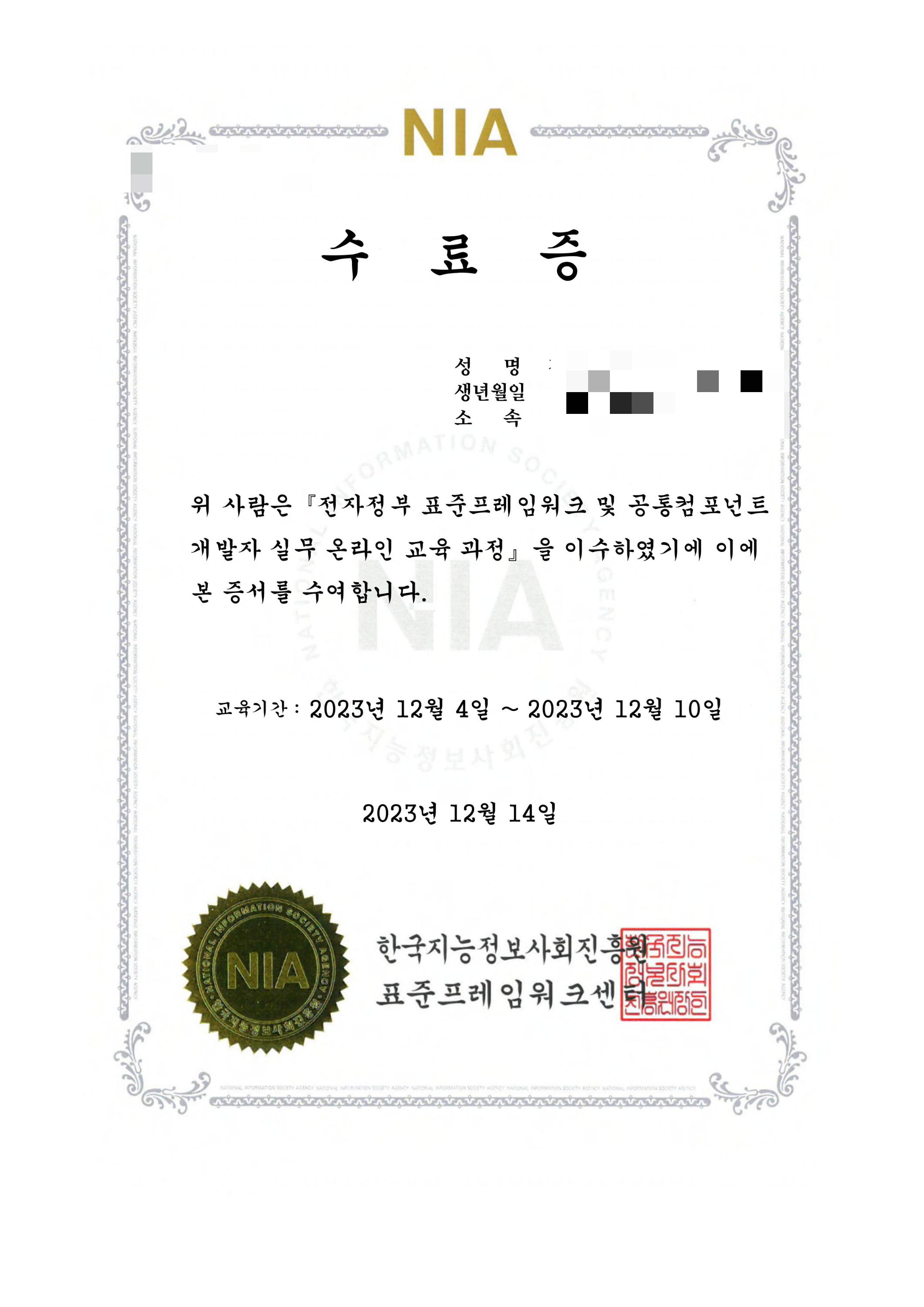 지난주에 예랑이와 함께 전자정부프레임워크 교육을 이수하고 수료증을 받았습니다.