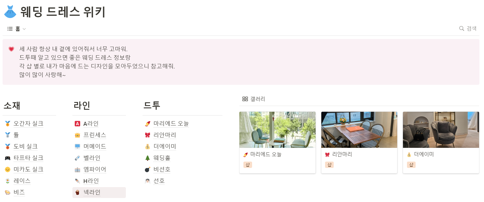 이건 뭐냐면!! 웨딩드레스에 대해서 잘 모르는 우리 모두를 위한 노션 페이지예요.