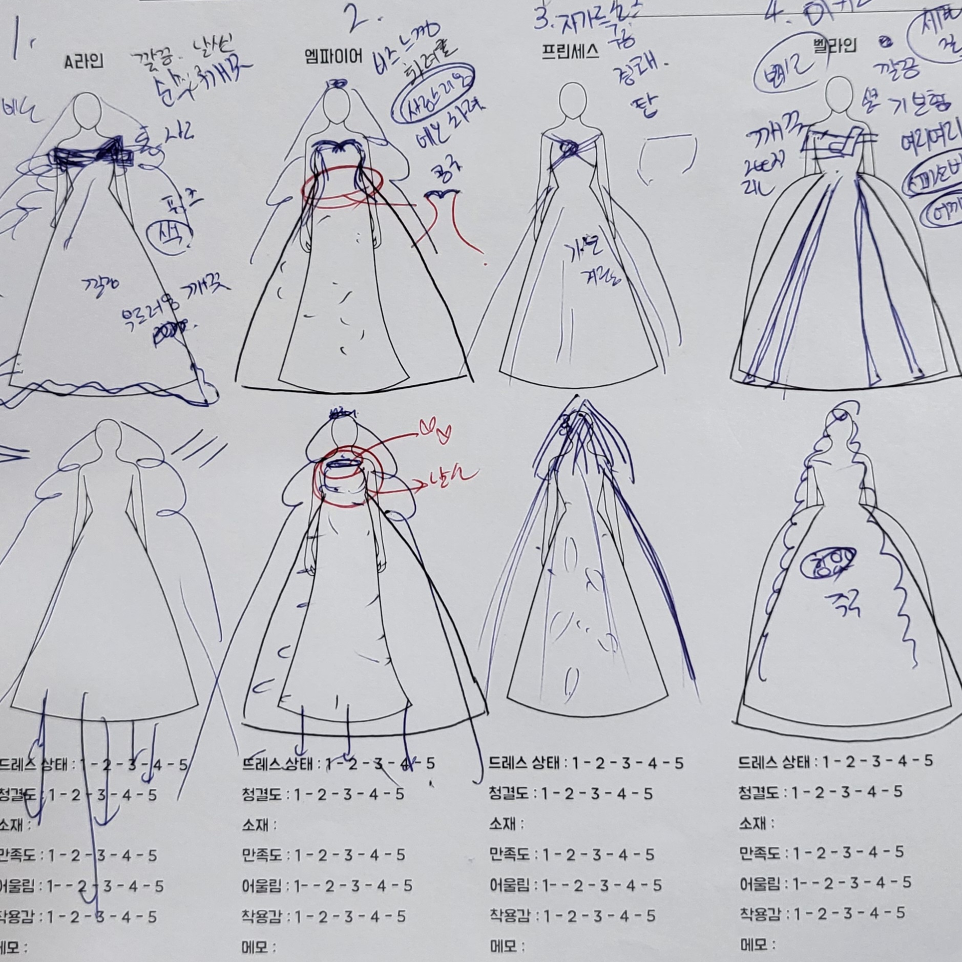 웨딩드레스의 소재와 라인, 그리고 넥라인까지 모든 설명을 적어두었고,