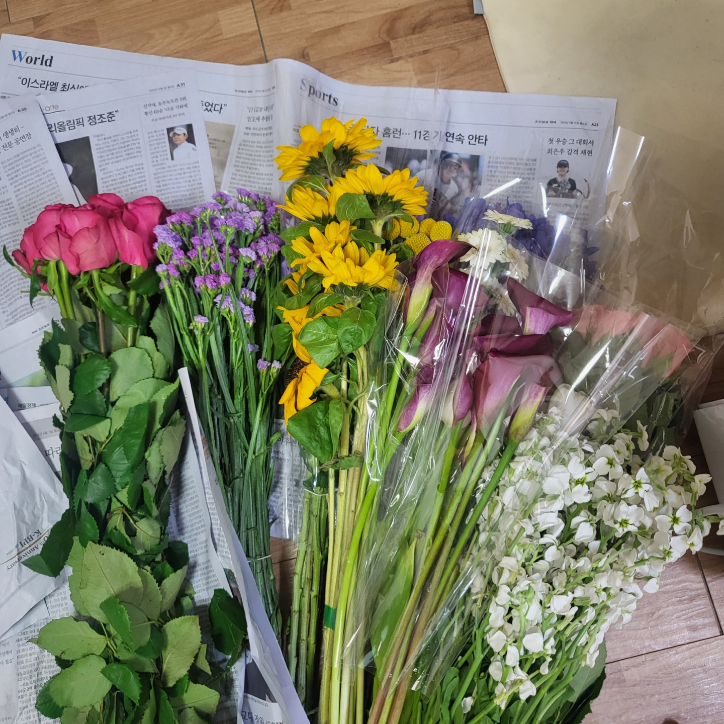 줄기를 길게 잘라서 갔는데, 작가님이 무기 같다고 하셔서 꽃가위로 급하게 잘랐어요.