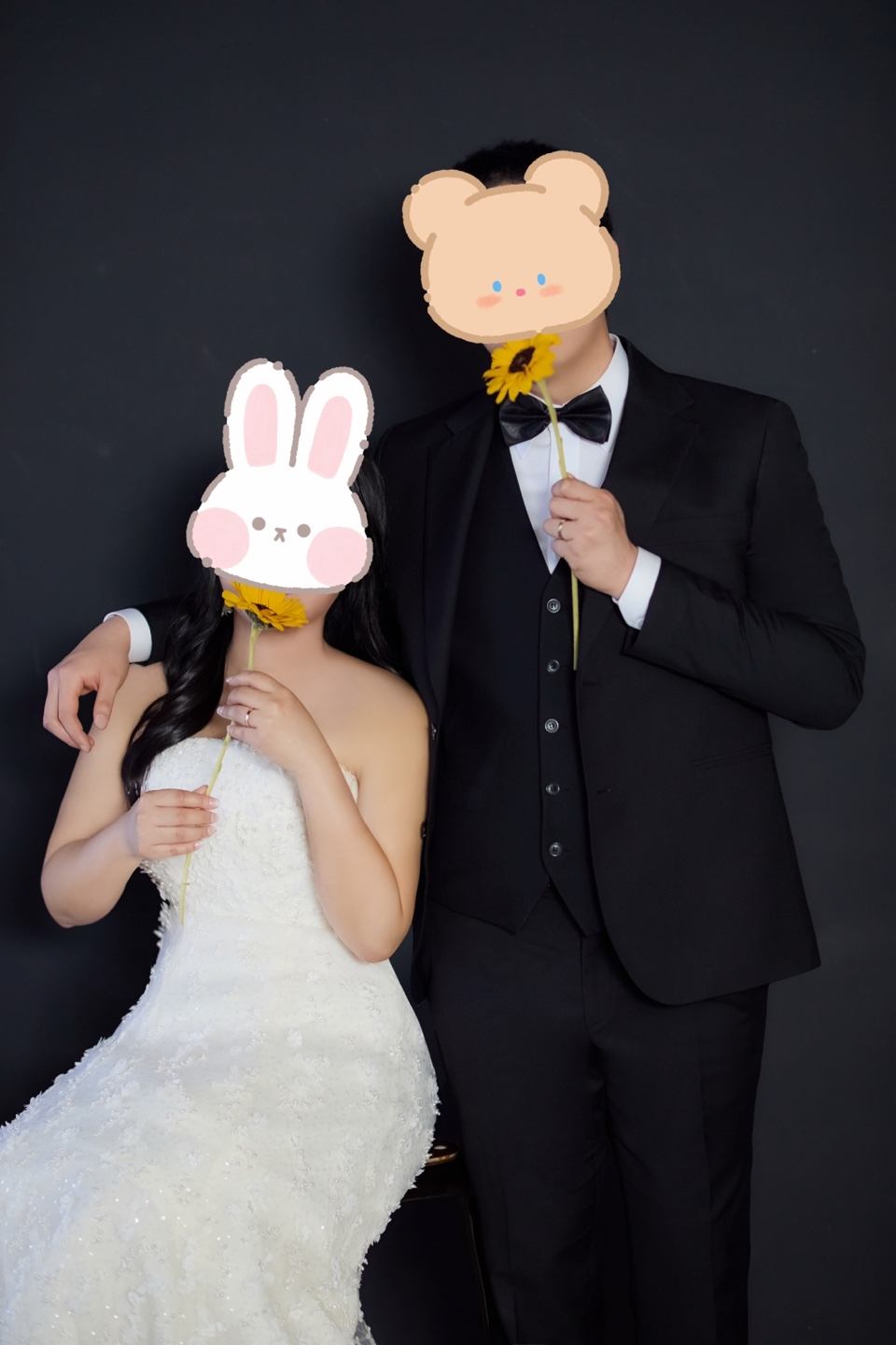 어두운 배경에 신랑도 검은색 슈트를 입었는데도 해바라기 덕분에 아주 깜찍한 사진이 되었습니다.