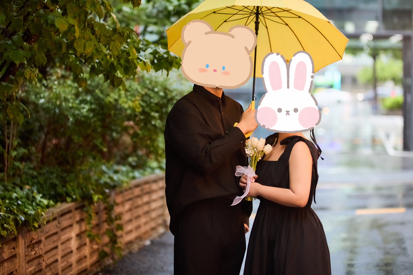 검은색 캐주얼과 스튜디오에서 빌려준 노란 우산이 정말 귀엽게 나왔습니다.