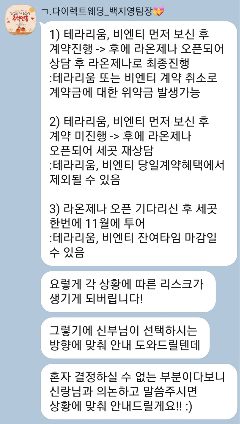 화요일에 다이렉트 웨딩홀 팀 팀장님이 연락이 왔습니다.